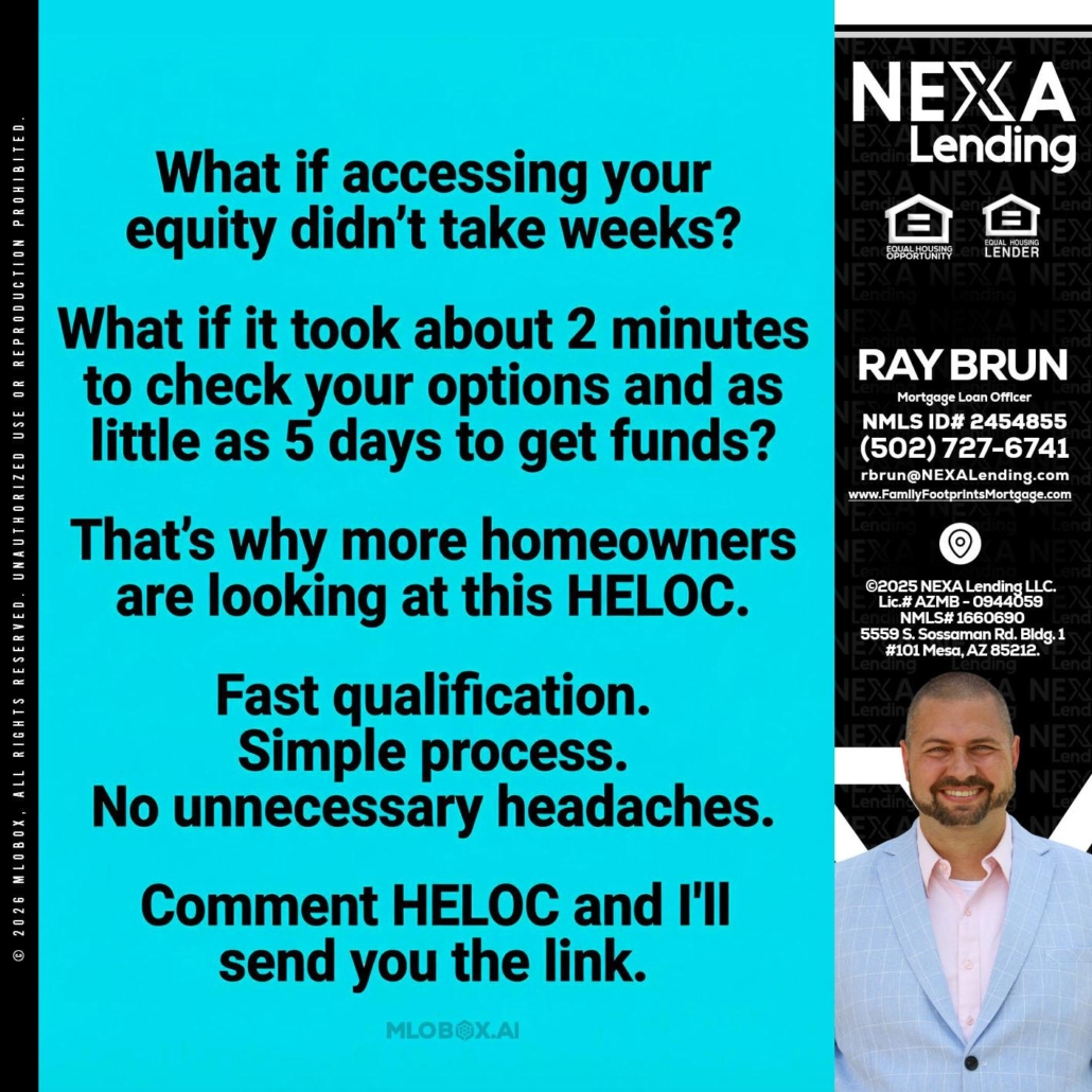 Hi, my name is Ray Brun. I’m a Loan Officer with NEXA Lending LLC., offering personalized mortgage solutions, fast customized quotes, great rates and service with integrity.